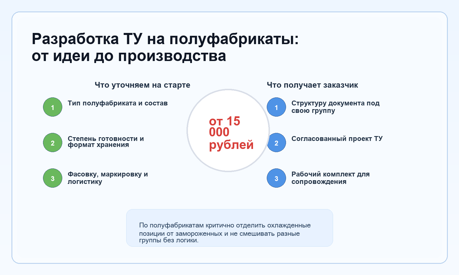 Одна из самых частых ошибок по полуфабрикатам — попытка описать весь ассортимент предприятия в одном документе. На практике это редко работает. Если в линейке различаются сырьевая база, технология, степень готовности или режим хранения, такие позиции лучше не смешивать. Пельмени, котлеты, сырники, блинчики и овощные полуфабрикаты обычно требуют разной логики даже внутри одного производства.